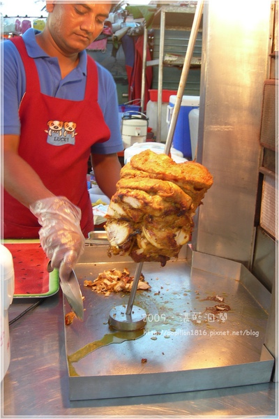 老闆面有冰霜,並且很可惜的沒有看到精湛的甩餅技巧(餅早就甩好先放在電鍋裡頭保存了),在點的時候猶豫了一陣,不知道該吃牛好還是雞好,之後看到旁邊烤的香噴噴的雞肉,當下立刻決定點雞肉甩餅~~~