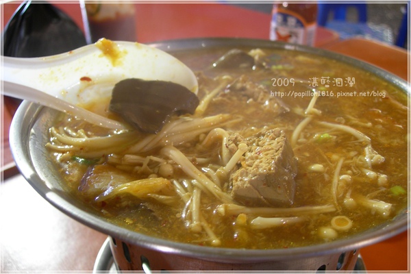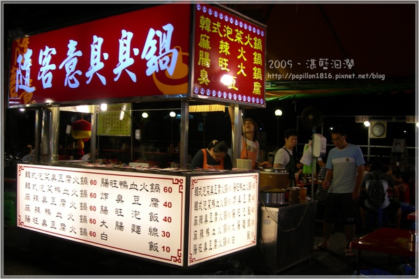 吃到一個程度後,想說來一個增加飽足感的Endding好了,這間臭臭鍋以他眾多的選擇以及廣大的座位區,加上最重要的有許多工業用大電扇伺候這樣得天獨厚的要件,雀屏中選。雖然還沒來到用餐時間,客隨意上餐速度就有點慢了,幸好,肚子已經不怎麼餓了。我們點的韓式泡菜鴨血/臭豆腐鍋感覺跟(我們)平常吃起來的經驗略有不同,是有「勾芡」+有「蛋花」的臭臭鍋,青菜方面略顯得少,點的是泡菜鍋,泡菜卻少得不得了,倒是有不少的金針菇。其中還有鴨血及臭豆腐,鴨血吃起來普普,臭豆腐則不錯,這間臭臭鍋算是這次南濱夜市裡頭表現比較普通的店家。