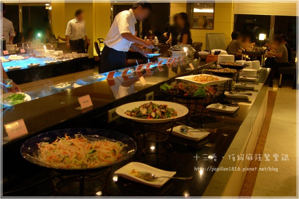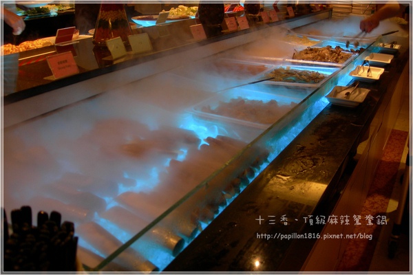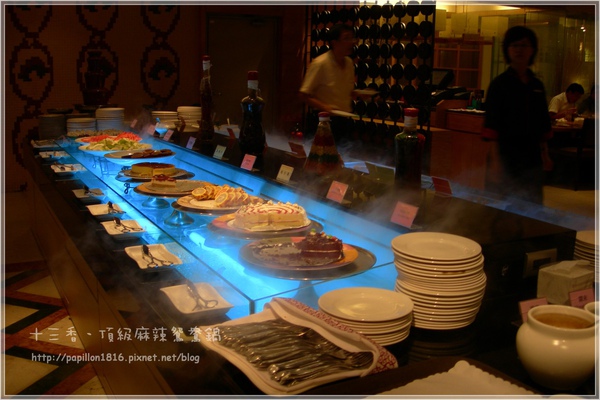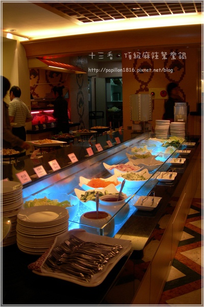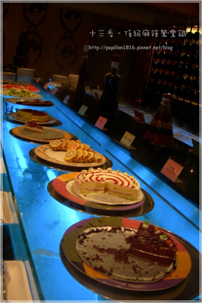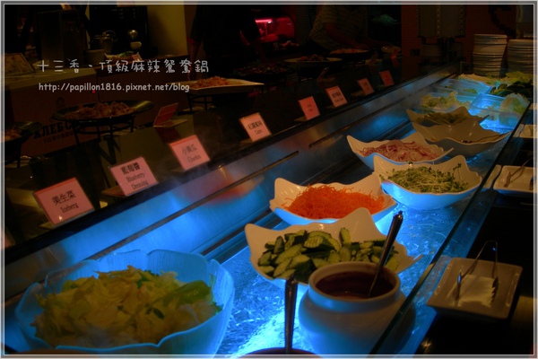 是的,這邊就是十三香的自助區,共有四行長條行的冰櫃,分別提共海鮮、蛋糕(甜點)、生菜、涼拌菜四大類供客人自行取用,光看到這樣的排場,整個就讓我大心~~~東西雖然稱不上精緻,但是味道都還不錯,讓大家麻辣鍋/自助吧兩難壓。