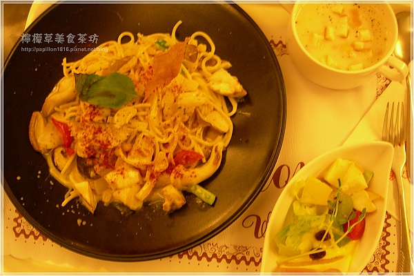 看的出來店家想要擺盤的用心(雖然看起來境界還不到),不過義大利麵的味道就24H茶飲店來說,實在不錯!義大利麵由香濃的白醬佐上青椒、蘆筍等蔬菜,配上多汁的綜合菇組合而成,,整個清爽又好吃!另外附上美味的濃湯以及份量不多但鮮度不錯的沙拉,適合食量不大的女生點來品嚐。
